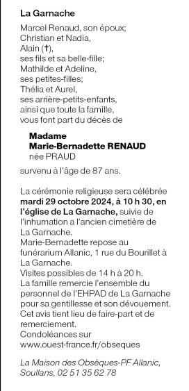 Décédée à La Garnache (85710, France) le jeudi 24 octobre 2024 à l'âge de 87 ans