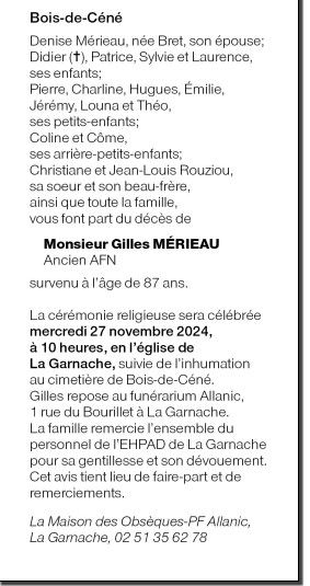 Décédé à Machecoul (44270, France) le samedi 23 novembre 2024 à l'âge de 87 ans