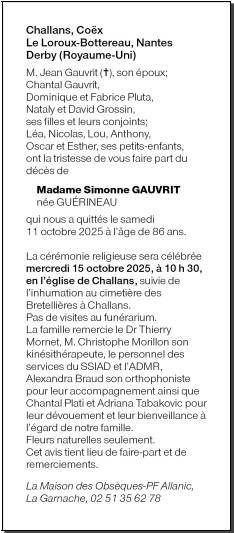 Décédée à Challans (85300, France) le samedi 11 octobre 2025 à l'âge de 86 ans