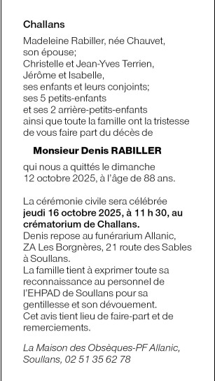 Décédé à Soullans (85300, France) le dimanche 12 octobre 2025 à l'âge de 88 ans