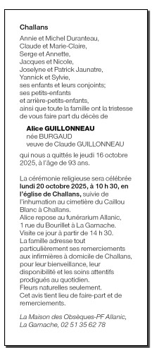 Décédée à Challans (85300, France) le jeudi 16 octobre 2025 à l'âge de 93 ans