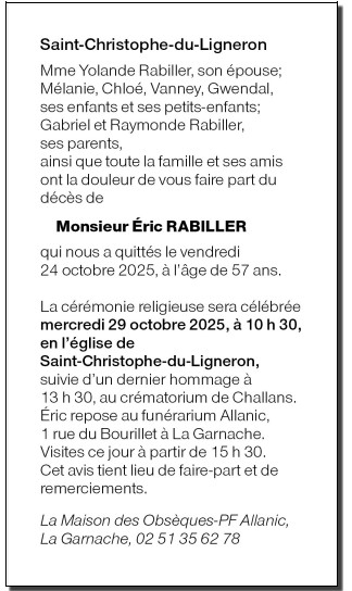 Décédé à Saint-Christophe-du-Ligneron (85670, France) le vendredi 24 octobre 2025 à l'âge de 57 ans