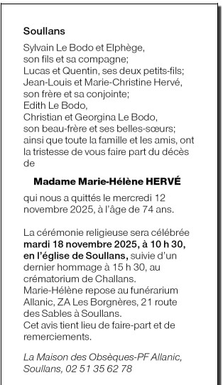 Décédée à Nantes (44000, France) le mercredi 12 novembre 2025 à l'âge de 74 ans
