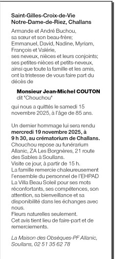 Décédé à Notre-Dame-de-Riez (85270, France) le samedi 15 novembre 2025 à l'âge de 85 ans