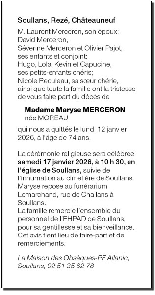 Décédée à Soullans (85300, France) le lundi 12 janvier 2026 à l'âge de 74 ans