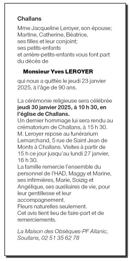 Décédé à Challans (85300, France) le jeudi 23 janvier 2025 à l'âge de 90 ans
