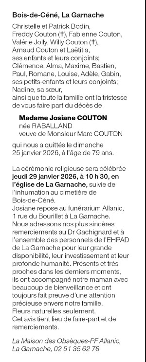 Décédée à La Garnache (85710, France) le dimanche 25 janvier 2026 à l'âge de 79 ans