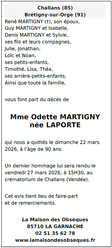 Madame Odette MARTIGNY née LAPORTE