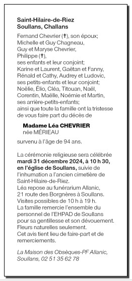 Décédée à Soullans (85300, France) le jeudi 26 décembre 2024 à l'âge de 94 ans