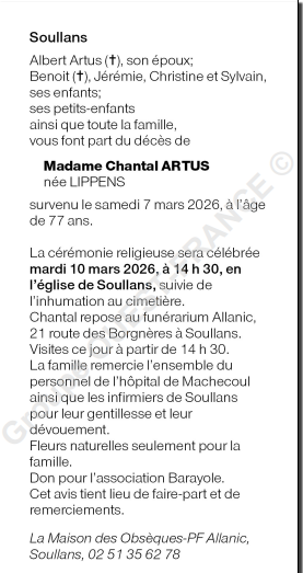 Décédée à Machecoul (44270, France) le samedi 7 mars 2026 à l'âge de 77 ans