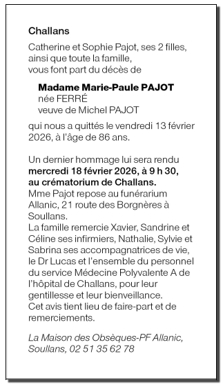 Décédée à Challans (85300, France) le vendredi 13 février 2026 à l'âge de 86 ans