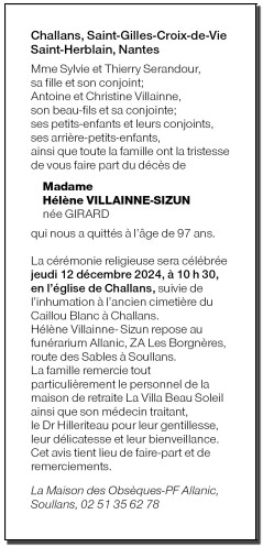 Décédée à Notre-Dame-de-Riez (85270, France) le mardi 10 décembre 2024 à l'âge de 97 ans