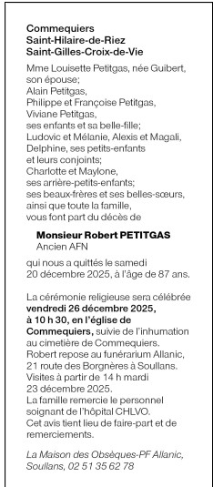 Décédé à Machecoul (44270, France) le samedi 20 décembre 2025 à l'âge de 87 ans