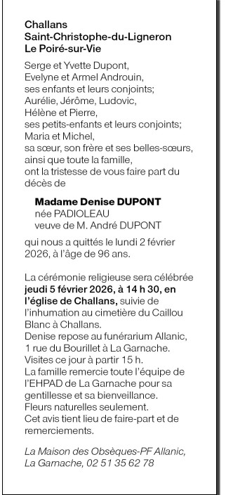 Décédée à La Garnache (85710, France) le lundi 2 février 2026 à l'âge de 96 ans