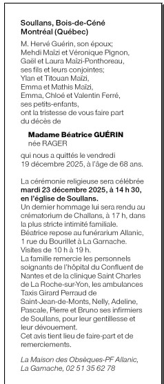 Décédée à Nantes (44000, France) le vendredi 19 décembre 2025 à l'âge de 68 ans