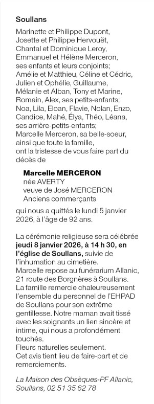 Décédée à Soullans (85300, France) le lundi 5 janvier 2026 à l'âge de 92 ans