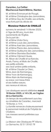 Décédé à Challans (85300, France) le vendredi 14 février 2025 à l'âge de 88 ans