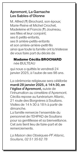 Décédée à Soullans (85300, France) le vendredi 24 janvier 2025 à l'âge de 97 ans