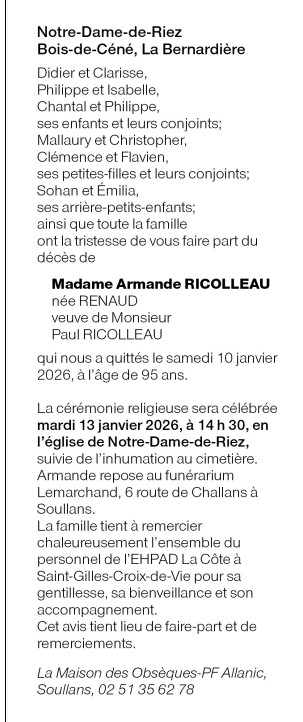 Décédée à Saint-Gilles-Croix-de-Vie (85800, France) le samedi 10 janvier 2026 à l'âge de 95 ans