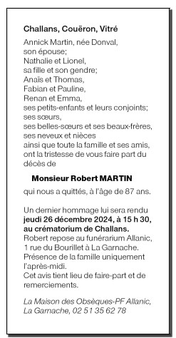 Décédé à Challans (85300, France) le dimanche 22 décembre 2024 à l'âge de 87 ans
