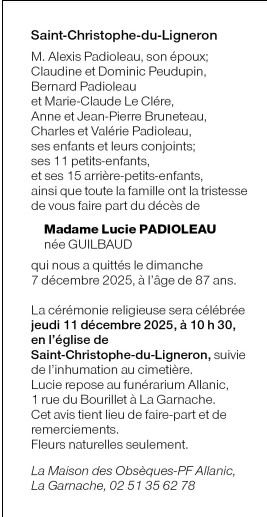 Décédée à Machecoul (44270, France) le dimanche 7 décembre 2025 à l'âge de 87 ans