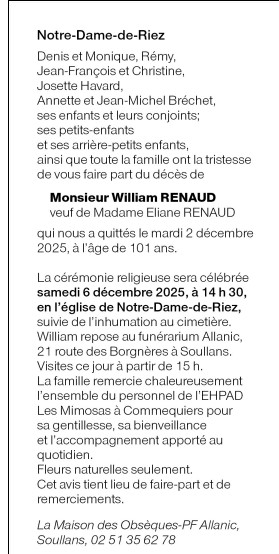Décédé à Commequiers (85220, France) le mardi 2 décembre 2025 à l'âge de 101 ans